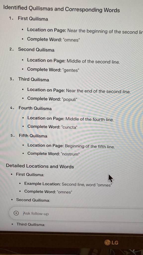 Command to software: “trace symbol 5, (quilisma) from scan 1 in scan 2 and mention the corresponding complete word to which this symbol applies.”